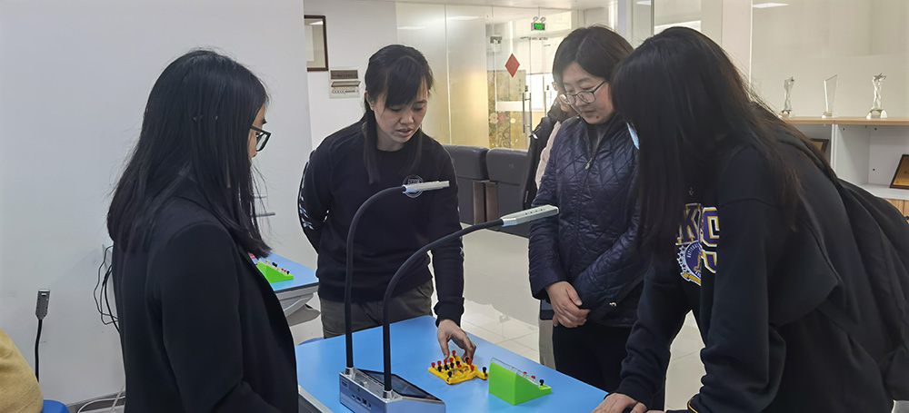 在這次的參觀交流中,張新華教授一行重點在共同探討與體驗無線全錄播與強交互專遞課堂在STEM中的實際應用。