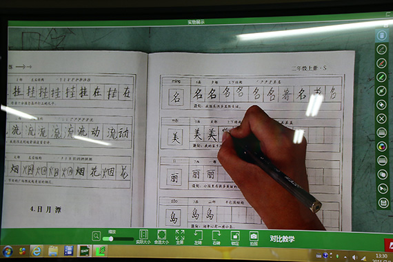 首先,在課程開始前,老師通過吉星無線視頻展臺將自己書寫或書本上面的示范樣本連接到黑板上,進行詳細的講解,,讓同學們能夠清晰的了解到書寫的要點和文字的詳細構(gòu)造。