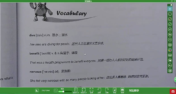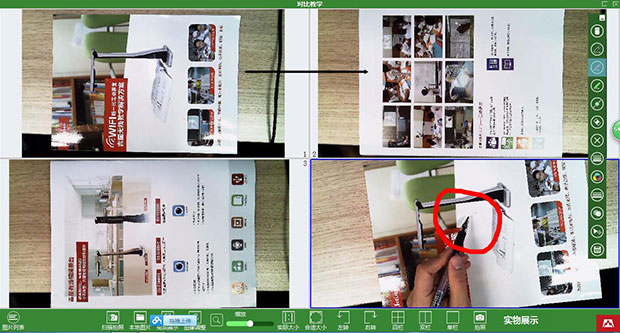 實(shí)物展臺(tái)功能是老師們?cè)谡n堂上用得最多的功能了。像素30萬(wàn)到500萬(wàn)的分辨率可自由調(diào)節(jié),展示的圖片大小可進(jìn)行縮放調(diào)節(jié),圖片可左轉(zhuǎn)、右轉(zhuǎn)。老師還可隨時(shí)拍攝、采集圖片。將教材放置在展臺(tái)底下進(jìn)行展示,500萬(wàn)高清鏡頭可清晰展示小五號(hào)的字體,并且沒(méi)有任何噪點(diǎn)和閃動(dòng)!