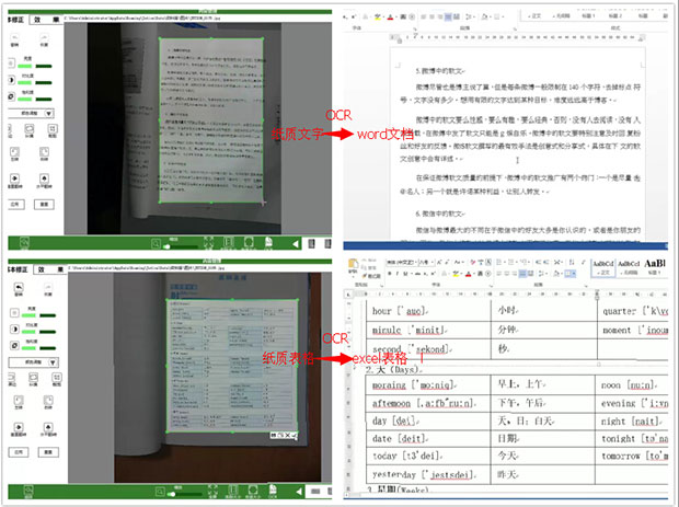 先把資料拍攝,截取想要識(shí)別的部分文件,選擇輸出格式,點(diǎn)擊識(shí)別,便可將圖片生成word或者excel等可編輯的文檔,大大提高備課、辦公效率。據(jù)我所知現(xiàn)在不少?gòu)S家的展臺(tái)都帶有OCR功能了,但是識(shí)別錯(cuò)漏百出,效果不盡人意。所以本來(lái)我對(duì)這個(gè)功能并不抱太大希望,測(cè)試結(jié)果卻有驚喜。純文字識(shí)別率非常高,幾乎找不出錯(cuò)誤;又嘗試了表格識(shí)別,表格中的中英文居然同時(shí)識(shí)別出來(lái)了,實(shí)在太強(qiáng)大了!