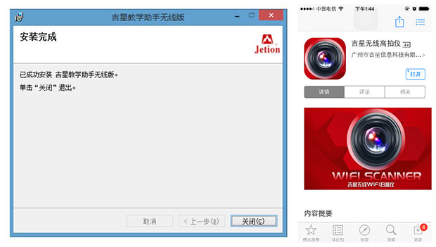 插入隨機(jī)附帶的光盤,里面有吉星無(wú)線教學(xué)助手軟件安裝包(setup.exe)、PDF格式的吉星無(wú)線教學(xué)助手使用說(shuō)明及安裝說(shuō)明。安裝非常簡(jiǎn)單,根據(jù)提示一步步進(jìn)行安裝,整個(gè)操作過(guò)程在1分鐘之內(nèi)完成。安裝完P(guān)C端程序后,我又忍不住給我的手機(jī)也進(jìn)行了移動(dòng)端的安裝,想兩者同步進(jìn)行測(cè)試,體驗(yàn)一下廠家宣傳的多平臺(tái)無(wú)縫對(duì)接。