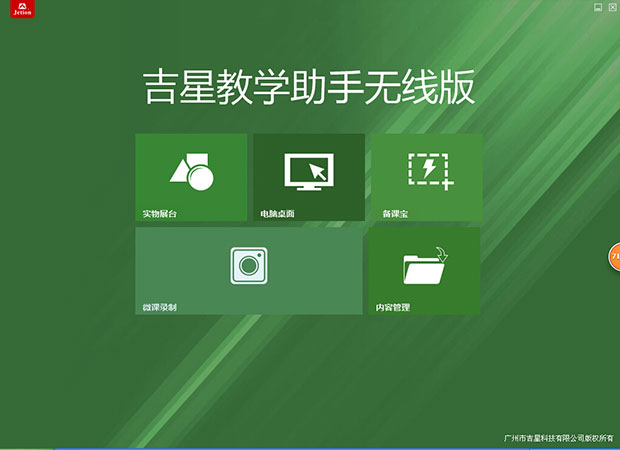 打開(kāi)無(wú)線視頻展臺(tái)開(kāi)關(guān),在手機(jī)和電腦的搜索吉星展臺(tái)的WiFi信號(hào)(Jetion_后綴),輸入原始密碼12345678,即可連接上設(shè)備。沒(méi)拿到展臺(tái)之前我還在疑慮:無(wú)線展臺(tái)雖說(shuō)可以脫線使用,但如果學(xué)校沒(méi)有無(wú)線網(wǎng)絡(luò),那無(wú)線功能再方便也不實(shí)用啊!用了才知道,無(wú)線展臺(tái)內(nèi)置WiFi模塊,自身會(huì)發(fā)射出WiFi熱點(diǎn)讓其它設(shè)備進(jìn)行連接,實(shí)在太方便了!但操作進(jìn)行到這里我又突然想到:像臺(tái)式機(jī),沒(méi)有WiFi功能那怎么進(jìn)行連接?帶著疑問(wèn)又翻翻說(shuō)明書(shū),果然廠家早就考慮到這個(gè)問(wèn)題,隨機(jī)附送了一個(gè)150Mbps無(wú)線USB網(wǎng)卡,給設(shè)備安裝程序后就可以接收WiFi了。無(wú)線網(wǎng)卡還可以解決設(shè)備連接展臺(tái)后不能同時(shí)上網(wǎng)的問(wèn)題。由此看來(lái)廠家真是服務(wù)貼心,誠(chéng)意十足!安裝完成后打開(kāi)桌面的軟件圖標(biāo),軟件界面非常簡(jiǎn)潔,綠色的主頁(yè)面只有五個(gè)方形功能模塊,以及一個(gè)簡(jiǎn)單的企業(yè)LOGO。